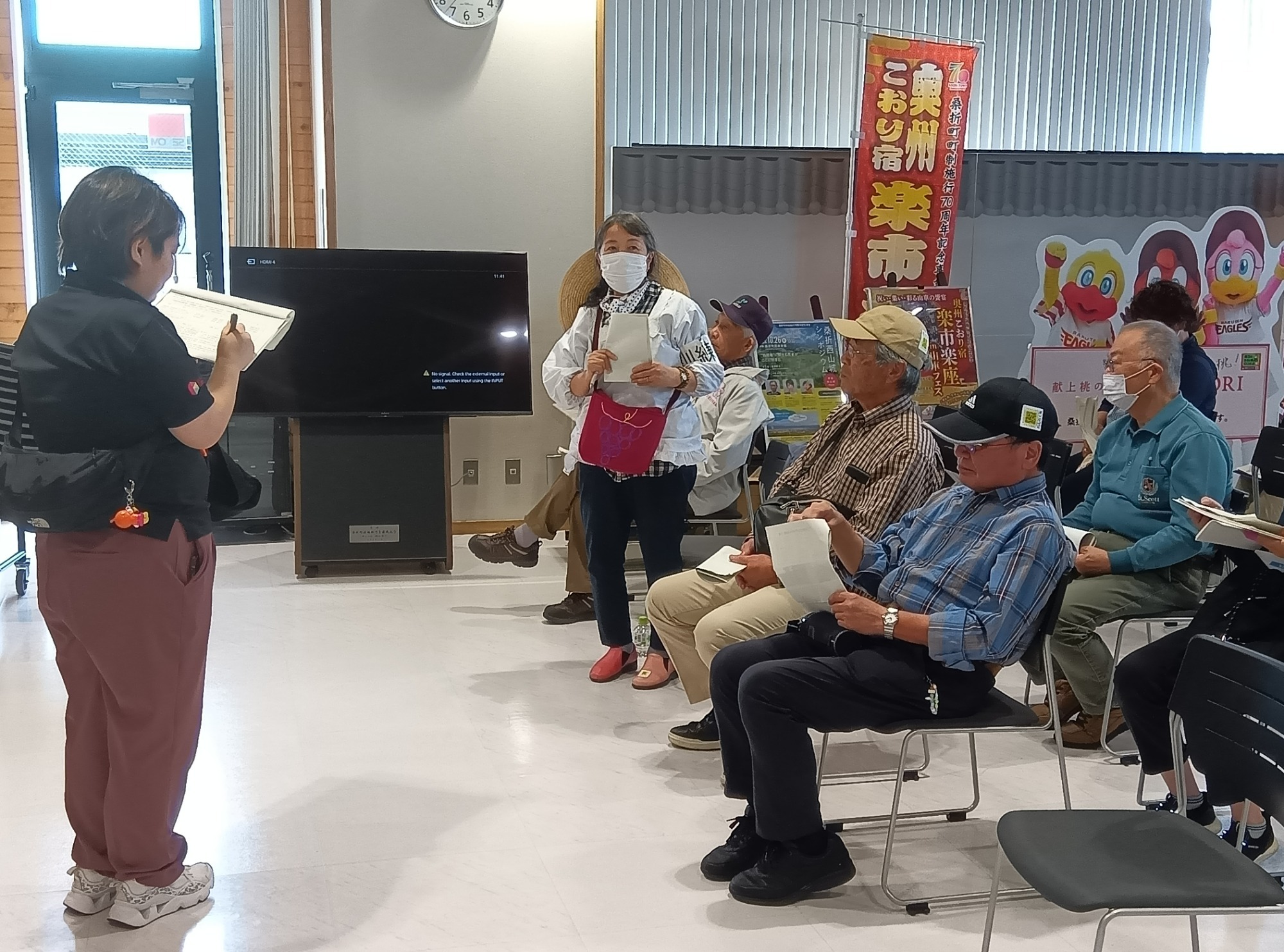そらいろデイサービス管理者の石幡さんからクイズを交えながら認知症ケアについてお話いただいたり、デイサービスで行っているレクリエーションを体験したり楽しく過ごしました。