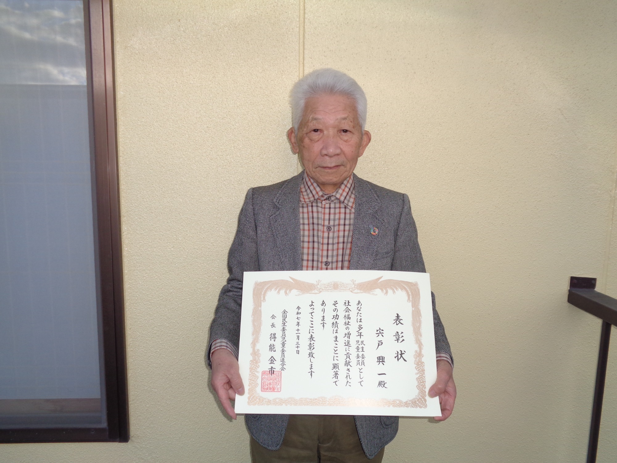 この度、令和7年11月30日に退任した本町の宍戸興一さんが永年勤続退任民生委員児童委員として表彰されました。
