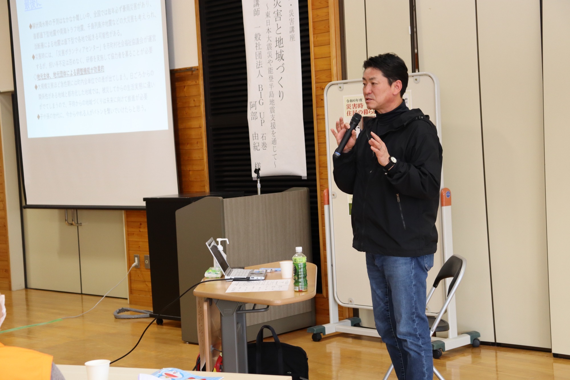 講師として、東日本大震災では石巻市の災害ボランティアセンターの運営、現在も能登半島地震等の現場で運営支援を経験されているBIG UP 石巻 代表理事の阿部由紀氏をお招きし、災害発生後の地域生活がどのように変化してまうのかなど、実体験をもとにお話ししていただきました。